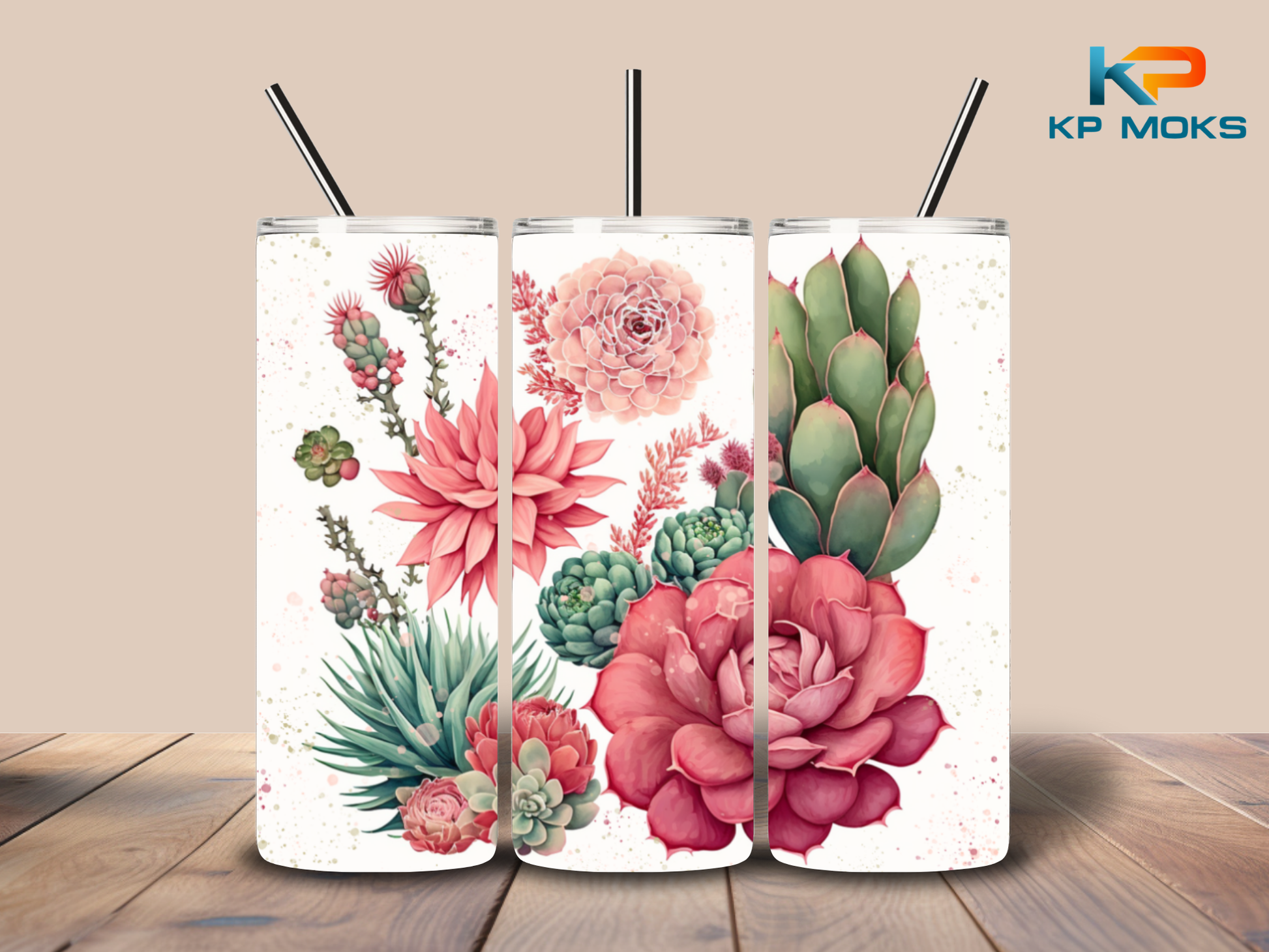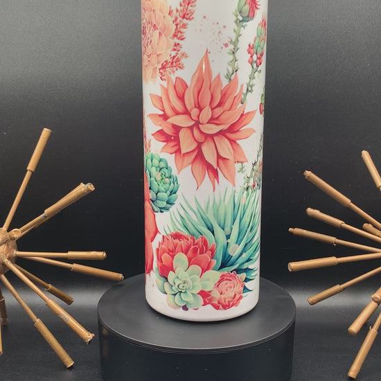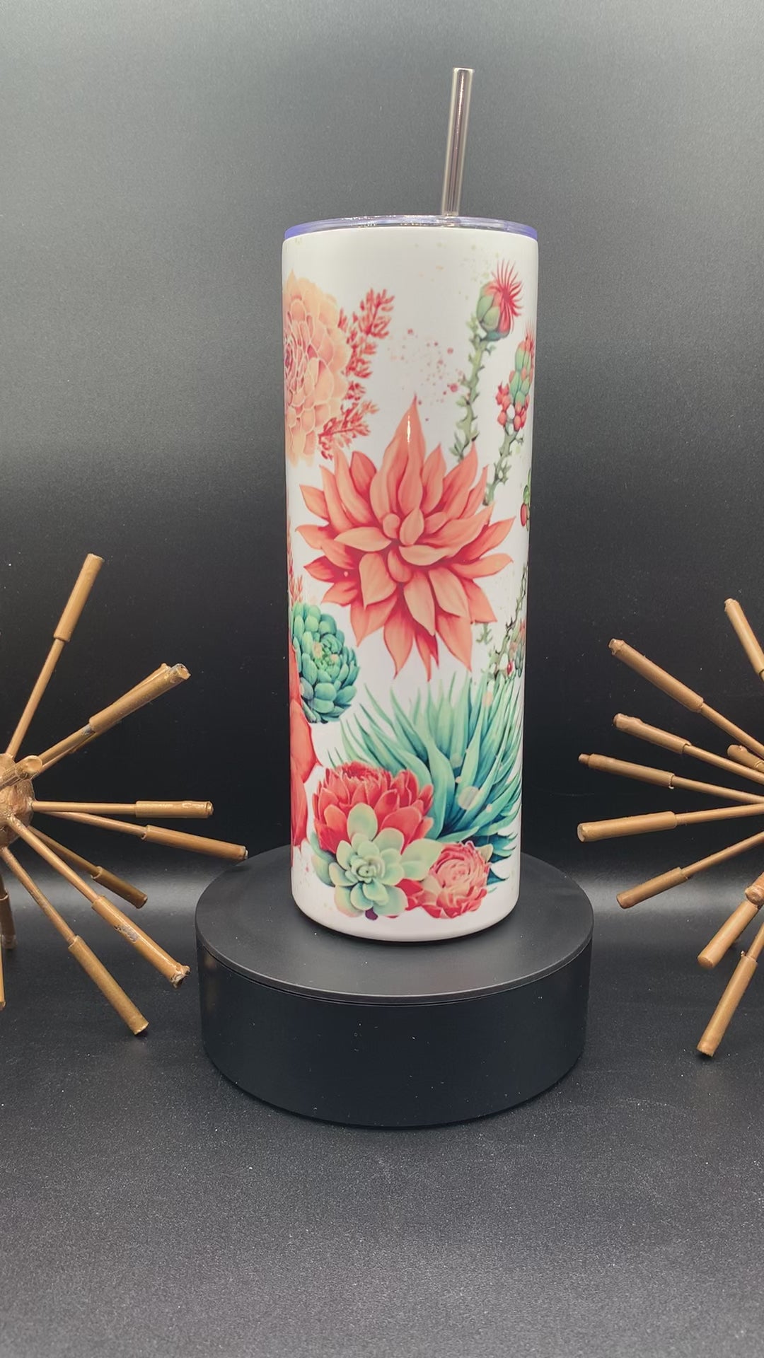 The colors of the desert are reflected in this beautiful succulent stainless steel tumbler that holds 20 fl. oz and comes with a clear lid and metal straw.